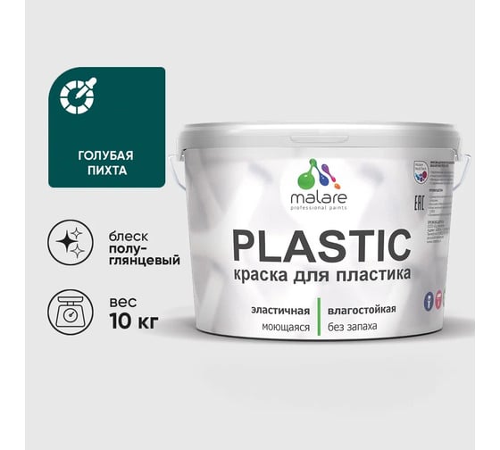 Резиновая краска для пластика MALARE Plastic для ПВХ, для подоконников и откосов, без запаха, полуглянцевая, голубая пихта, 10 кг 4660504717086