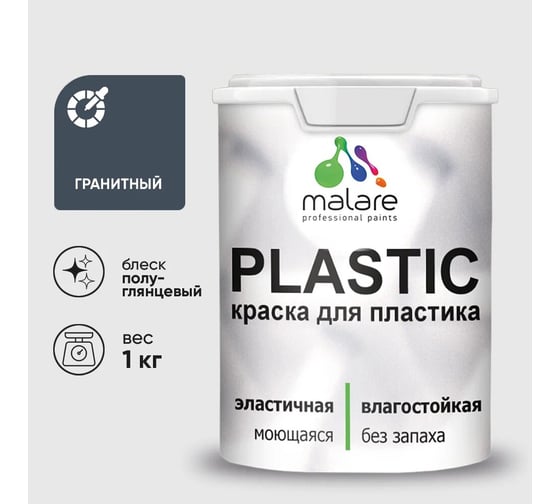 Резиновая краска для пластика MALARE Plastic для ПВХ, для подоконников и откосов, без запаха, полуглянцевая, гранитный, 1 кг 4660504717192