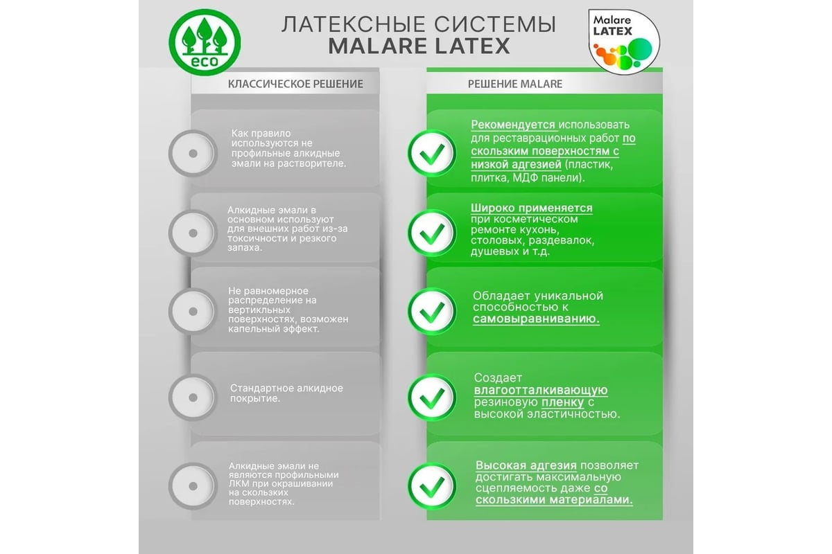 Расход на один слой - 8 кв. м/кг по гладким поверхностям, подготовленным материалами Malare. Расход на рельефные поверхности не нормируется.