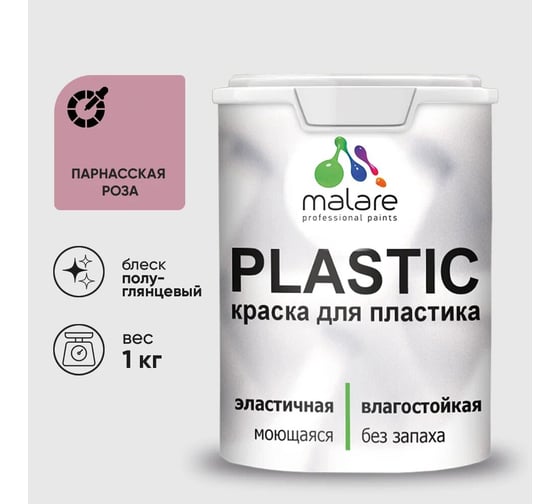 Резиновая краска для пластика MALARE Plastic для ПВХ, для подоконников и откосов, без запаха, полуглянцевая, парнасская роза, 1 кг 4660504718113