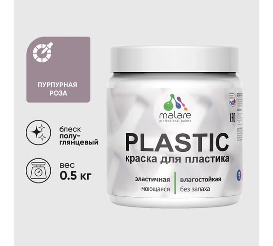 Резиновая краска для пластика MALARE Plastic для ПВХ, для подоконников и откосов, без запаха, полуглянцевая, пурпурная роза, 0.5 кг 4660504718304