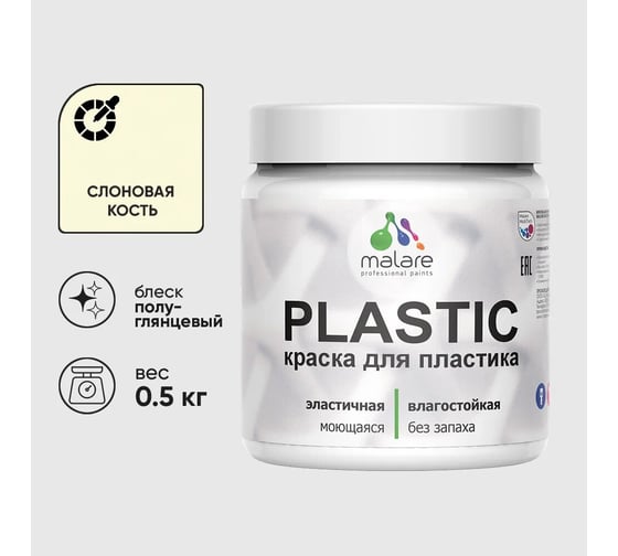 Резиновая краска для пластика MALARE Plastic для ПВХ, для подоконников и откосов, без запаха, полуглянцевая, слоновая кость, 0.5 кг 4660504718700