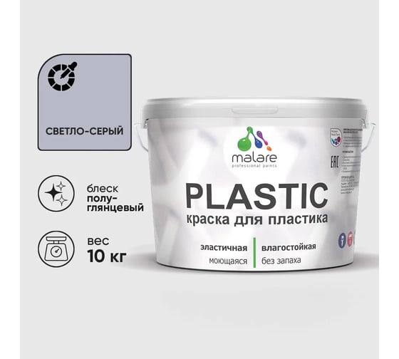 Резиновая краска для пластика MALARE Plastic для ПВХ, для подоконников и откосов, без запаха, полуглянцевая, светло-серый, 10 кг 4660504718601