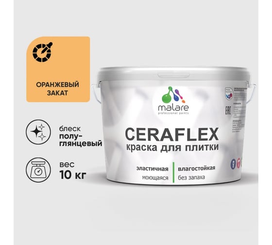 Краска резиновая MALARE Ceraflex для плитки, оранжевый закат, полуглянцевый, 10 кг 4660504714047