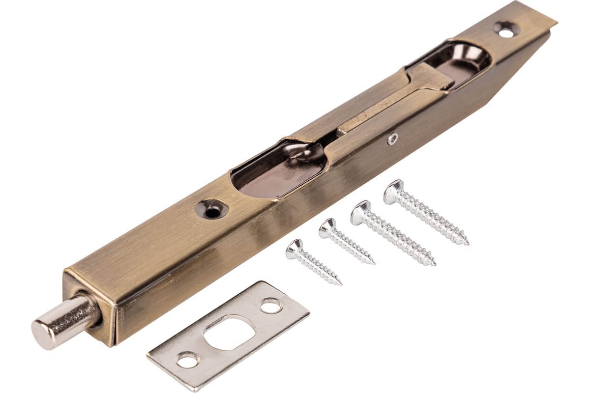 Обычный ригель, работает. В комплекте идет крепеж в виде саморезов и ответная часть.