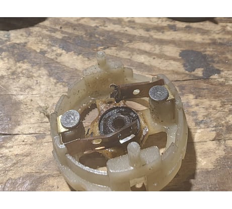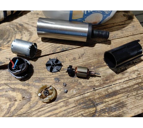 Для перелива 120 литров как то дороговато. Сгорел контакт щетки на 15-ом литре перекачки. Стал медленней крутить и просто встал. Разбор полетов показало фото ниже....
