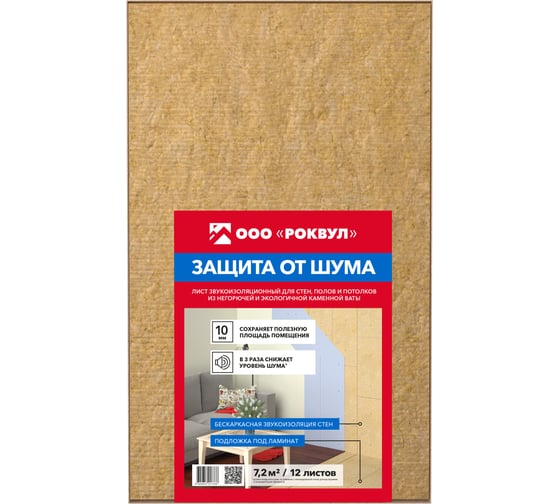 Тонкий звукоизоляционный материал РОКВУЛ обладает толщиной листа всего в 10 мм. Благодаря этому полезная площадь помещения сохраняется, а сам лист, несмотря на тонкость, обеспечивает высокую эффективность звукопоглощения. Он выполнен из каменной ваты, а это означает его натуральность и отличную экологическую безопасность. Это одно из наиболее тонких решений, которые применяются в строительстве. Если применять эту разновидность, чтобы дополнительно звукоизолировать стены, удастся справиться с воздушной разновидностью шума и снизить его степень до 55 дБ. При применении листа в виде подложки под напольное покрытие можно бороться с ударным типом шума, минимизируя его степень на 18 дБ.