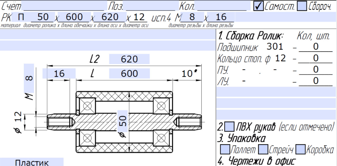 Материал изготовления ролика пластикового: обечайка - труба пластиковая 50х8,3 SDR6, ось - стальной пруток калиброванный ст20 13мм, подшипник 301zz.