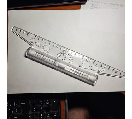 Отличная линейка в помощь для черчения, ходовой размер, калиброванные отверстия, транспортир, и миллиметровое деления на вращающемся барабане.
