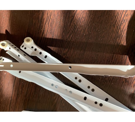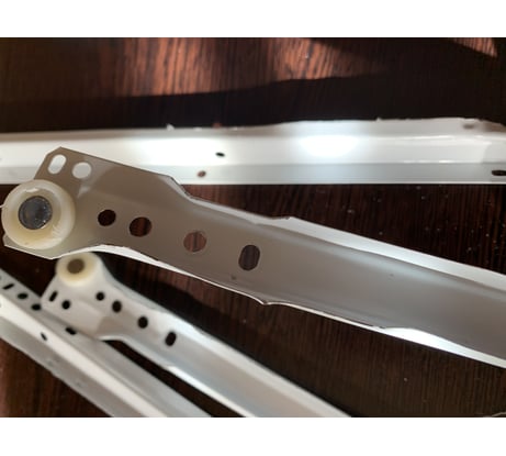 Эмаль, которой окрашены направляющие, имеет не белоснежно белый цвет - присутствует легкий голубовато-серый оттенок. Однако, с расцветкой моей мебели этот оттенок гармонирует больше, чем контрастный белый цвет.