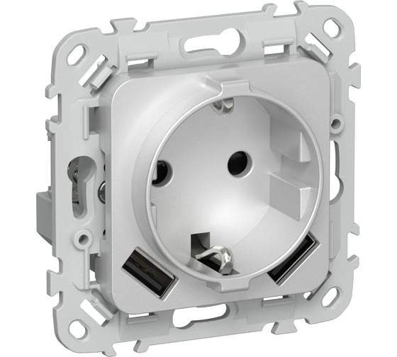 Розетка IEK FLITE с заземляющим контактом и шторками, 16А USB AA 3,1А б/к РСЮша11-1-ФлА алюминий FI-R14-16-1-U21-D31-K47
