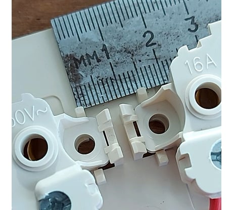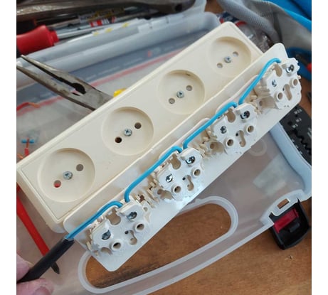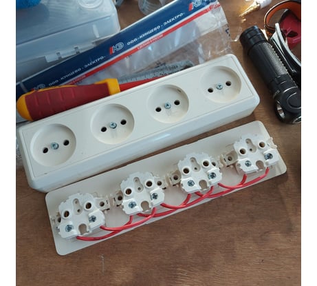 — внутренние соединения выполнены многожильным проводом без заделки оголённых концов; — розетки расположены в линию; — крепления розеток расположены в линию с маленьким шагом между внутренними крепёжными отверстиями.