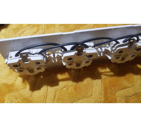Неудачная конструкция. Розетка представляет собой набор из четырёх обычных одинарных розеток на общей основе, соединённых между собой перемычками. Перемычки из тоненького многожильного проводочка (по ощущениям хорошо если 0,75 кв.мм, а то и вообще 0,5 кв.мм), не обжатого наконечниками. Невозможно подключение толстой жилы (в моём случае 2,5 кв.мм), т.к. подключаемая жила и перемычка не зажимаются одновременно (там один винт с площадкой). Переделал сам перемычки - всё, конечно, работает. Но стОит ли покупать товар, чтоб потом его "допиливать напильником"...