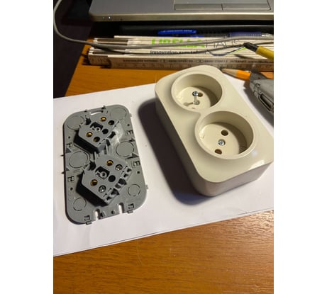 Накладная розетка без заземления. Гнёзда в розетке объеденены внутри пластикового основания.