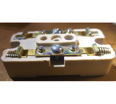 Керамическая внутренняя часть. Подпружиненные нормальными пружинами контакты. По внешнему виду --- хороший металл в контактах.