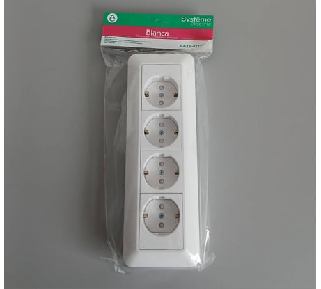 Розетка четырёхместная Systeme Electric (ранее Schneider Electric) BLANCA (открытой установки, цвет белый) с заземлением и со шторками, с монтажной стальной пластиной.