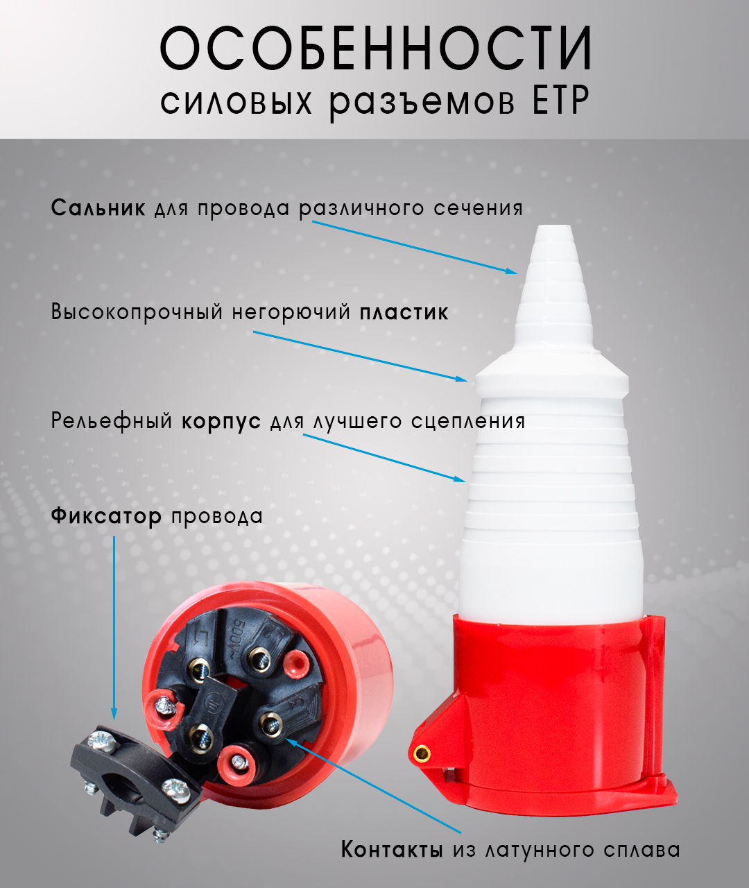 Розетка силовая №225 3Р+РЕ+N 32А 380В IP44 ETP – мобильный силовой разъем, предназначенный для подключения мощных электрических приборов и оборудования, которые потребляют мощность до 12 кВт.