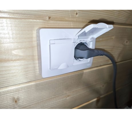 Удобная розетка на 2 гнезда в одном подрозетнике для установки в ванной комнате. Крышка имеет 2 положения - полностью открытая и полностью закрытая (или на вилке)