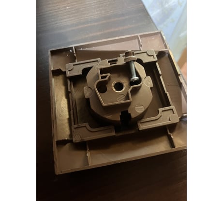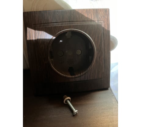 При монтаже розетки произошло отслоение посадочного гнезда крепежного винта центральной вставки. Причем отслоение гнезда произошло через 2 минуты после затяжки винта, что исключает перезатяжку при закручивании. Винты на клеммах гнезд для проводов имеют перекошенные ассиметричные шлицы, что затрудняет завертывание.