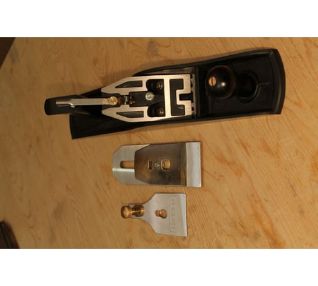Масса с упаковкой не 4.8 кг, как указано в описании - а 4.08 кг. Масса рубанка 3.66 кг. Длина 450 мм. Ширина ножа 60 мм. Корпус и лягушка чугунные. Лягушка более массивная, чем у фуганка Сестроретского завода. Прижим и ярмо регулировки вылета ножа литые. Тип сплава, из которого они отлиты, определить не смог. Сплав при опиливании белого цвета, с еле заметным желтоватым оттенком (на гране глюка). Ручки деревянные. Задняя для моей небольшой руки кажется маловатой. Подошва рубанка имеет небольшую вогнутость вдоль длины. Между ней и лекальной линейкой с трением проходит щуп 0.06 мм. По ширине искривления не заметно. Отклонение угла от 90 градусов между подошвой и боками составляет +0.09 (9 сотых) градуса. Ротик довольно широкий. С родным ножом максимальное расстояние от передней части до режущей кромки 3.5 мм. С завода стружколом отстоял от режущей кромки на 3-4 мм. Поставил 0.8 мм и не смог регулировкой добиться чтобы нож стал выступать за край подошвы. НЕ ХВАТАЕТ! При изучении стало ясно, что стружколом нельзя установить от режущей кромки на расстояние менее 2.5 мм. Головка винта крепления его к ножу упирается в прилив лягушки, куда закручен винт крепления прижима к лягушке. И дальше стружколом просто не выдвинуть. Пришлось его распрямить в тисках. При этом его длина увеличилась примерно на 2.5 мм. Плоскости обоих ножей грубо обработаны в отличие тех, что можно было купить отдельно. По фото видно, что одна половина лягушки не шлифована после отливки. Измерения показали, что разность толщин с разных сторон составляет около 1.5 мм. Эту величину никак не компенсировать регулировкой наклона ножа. Только шлифовка лягушки. Шлифовка оказалась вдвойне полезной, т.к. даже с родным ножом (толщина 2.25 мм) конец ярма регулировки вылета еле-еле доставал до стружколома (как только винт стружколома упирался в прилив лягушки ярмо теряло контакт со стружколомом). После шлифовки контакт есть всегда. Но все равно еще решил увеличить вылет ярма на 0.7 мм, переместив и увеличив отверстие в ярме надфилем и рассверлив отверстие под его ось в лягушке до 4.5 мм. Ручка регулировки наклона ножа просто гнутая из стальной заготовки. Имела вертикальный люфт, поэтому иногда терялся ее контакт со стенками паза ножа. Ручку распрямил. Из латуни выточил цилиндрический кулачок и прикрутил его к ручке. В ручке рассверлил отверстие под ось до 4.3 мм. В лягушке в отверстии под ось нарезана резьба 4 мм. Выточена новая ось 4.3 мм с резьбой на конце 4 мм. На устранение недостатков потрачен 1 день. Аналогичный Dictum можно купить примерно в три раза дороже. Думаю стоило потратить 1 день и сэкономить две стоимости этого рубанка. Можно еще изготовить новое ярмо. Уменьшить тем самым люфт регулировки вылета ножа. И сменить винтовой прижим на классический - эксцентриковый.