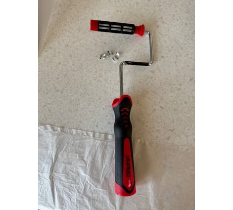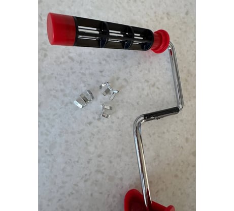 очень хлипкое крепление валика, сломалось/рассыпалось сразу же при аккуратном снятии валика. Без этого крепления валик уже не держится на бюгеле и слетает с него. Пришлось намотать на край несколько слоев малярной ленты, чтоб валик не спадал и аккуратно без размаха красить, благо маленькая поверхность окрашивания. Но сам бюгель очень удобный, валик крутится легко.