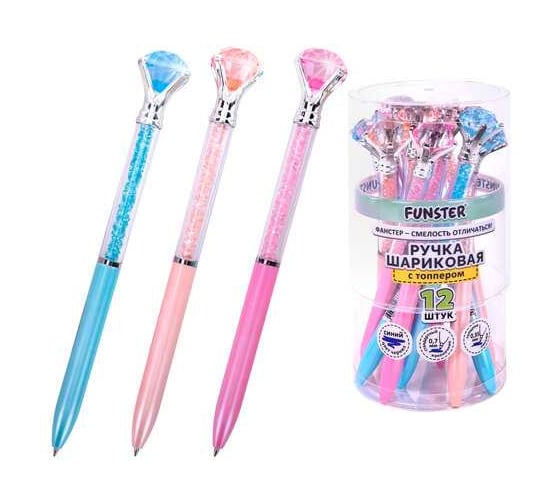 Ручка с топпером шариковая FUNSTER Shine Bright,СИНЯЯ, корпус ассорти, КОМПЛЕКТ 12 шт., линия письма 0,35мм 144377