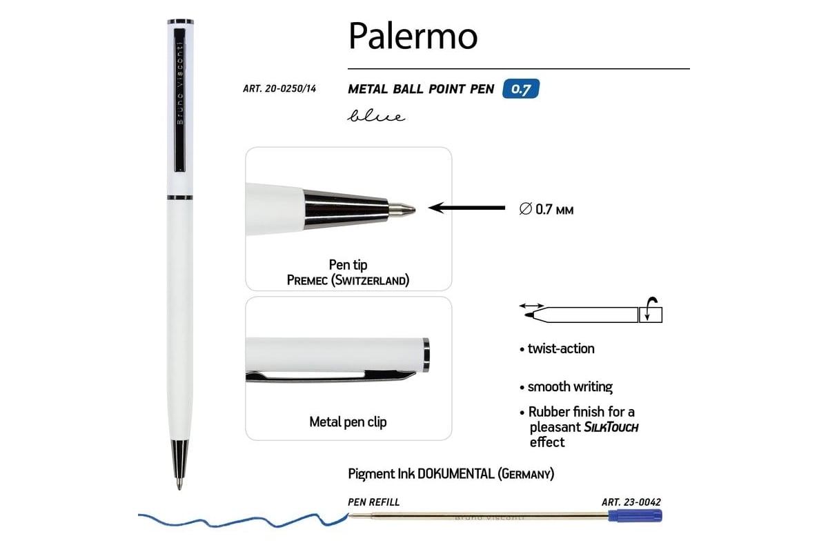 Технические характеристики ручки Bruno Visconti palermo белый металлический корпус, 0,7 мм, синяя 20025014 1641297