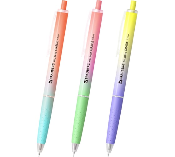 Автоматическая шариковая ручка BRAUBERG "OIL-BASE GRADE", элегантная модель доступна в трёх нежных пастельных градиентах: голубой-розовый, зелёный-персиковый и фиолетовый-желтый – идеальное сочетание для тех, кто ценит изящность и индивидуальность.