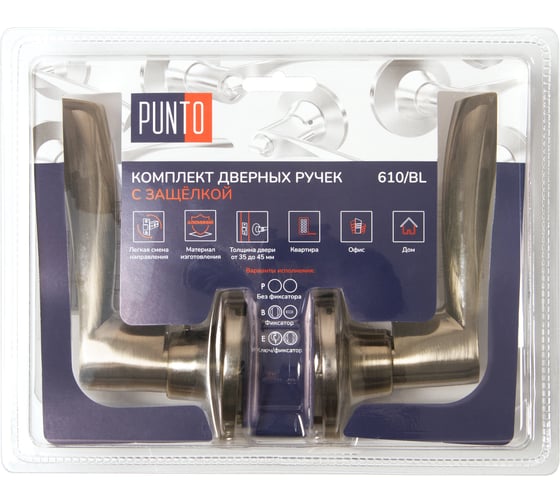 Комплект дверных ручек с защелкой (KNOB) Punto предназначен для установки в межкомнатные двери толщиной 35-45 мм. Подходит для дверей правого и левого открывания. Гальваническое покрытие прошло тест на устойчивость к коррозии в соляном тумане и соответствует 1 классу ГОСТ. Бэксет защелки регулируется - 60/70 мм. Материал изготовления: сталь. Комплектация: защелка, ответная планка с декоративной заглушкой, дверные ручки, крепежная фурнитура, шаблон и инструкция по установке.