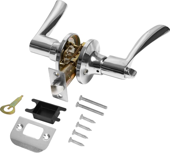 Комплектация: защелка, ответная планка с декоративной заглушкой, дверные ручки, крепежная фурнитура, шаблон и инструкция по установке.