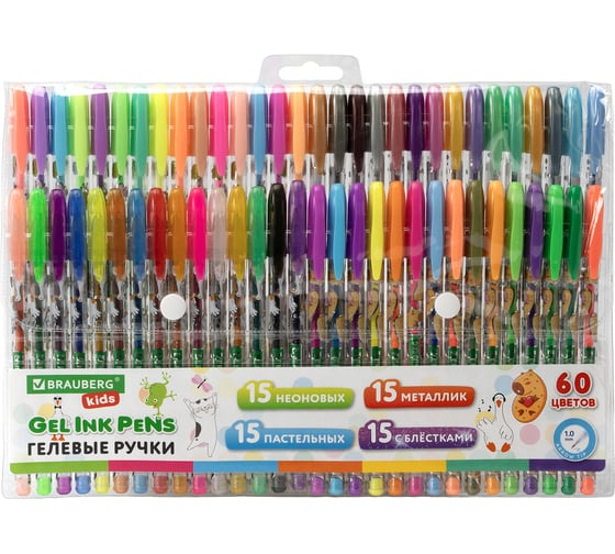 Ручки гелевые BRAUBERG KIDS CUTE ANIMALS, НАБОР 60 ЦВЕТОВ, линия письма 0,7 мм 144450