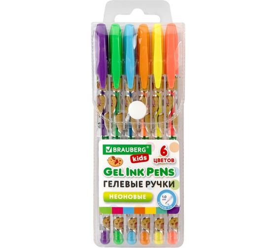 Ручки гелевые BRAUBERG НЕОНОВЫЕ KIDS CUTE ANIMALS, НАБОР 6 ЦВЕТОВ, линия письма 0,7 мм 144442