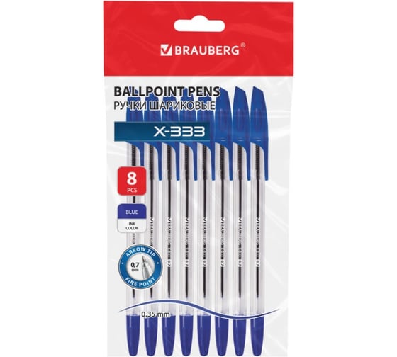 Ручки шариковые BRAUBERG X-333, НАБОР 8 ШТУК, СИНИЕ, узел 0,7 мм, линия письма 0,35 мм, 144527