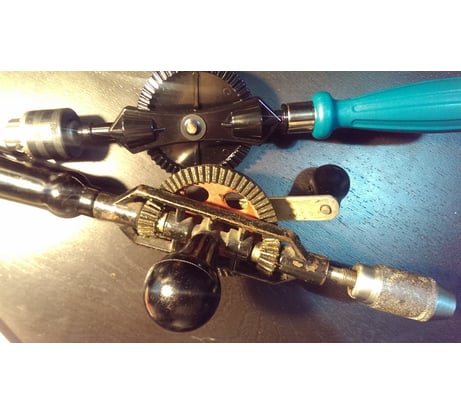 1) в рукоятке можно хранить сверлышки и биты. 2) патрон с резьбой 3/8-24UNF - можно поставить другой и расширить диапазон свёрел до 10мм. (см. фото). 3) не требует электричества (порой внезапно отключаемого) и (регулярно сдыхающих) аккумуляторов. 4) можно сверлить очень неторопливо (медитация) и поэтому аккуратно.
