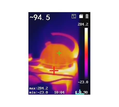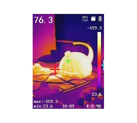 Качественный прибор, но есть странности. Инструкции производителя нет, разбирался с англоязычной, взял с сайта. После покупки был полностью заряжен ( производитель рекомендует первую зарядку 48-72 часа), но не сохранял настройки даты и времени, после отключения через пару часов сбрасывались до заводских. Поменяли, эффект тот же. Предположил, что аккумулятор часов заряжается ТОЛЬКО ПРИ ВКЛЮЧЕНИИ КАМЕРЫ. Оставил на зарядке во включенном состоянии на три дня, всё заработало. На снимках ладонь в двух вариантах палитры и чайник на газу.