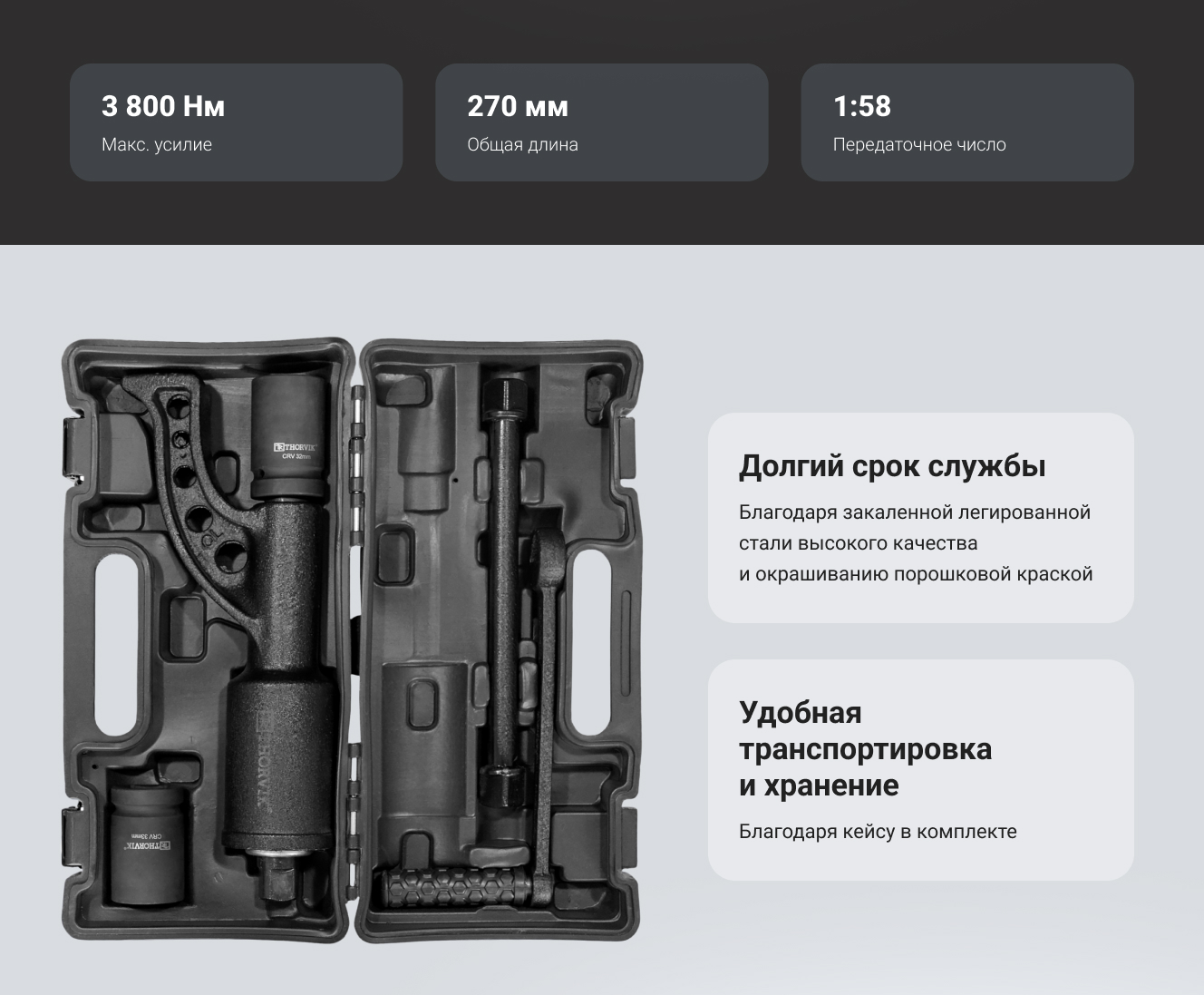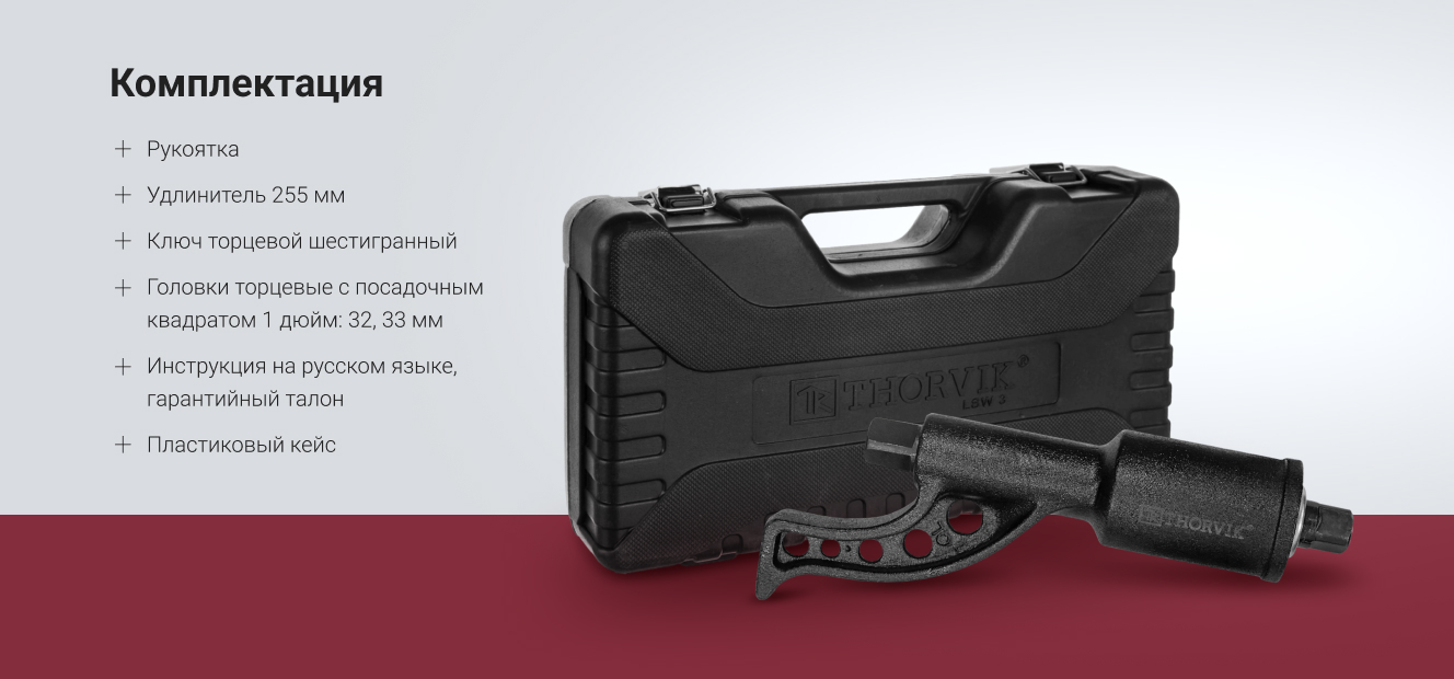 Ручной механический удлиненный гайковерт 3800 Нм и головки торцевые 32 мм, 33 мм Thorvik LSW3 52754 удобен в использовании за счет высокого передаточного отношения. Это позволяет с меньшими усилиями отвернуть гайки.