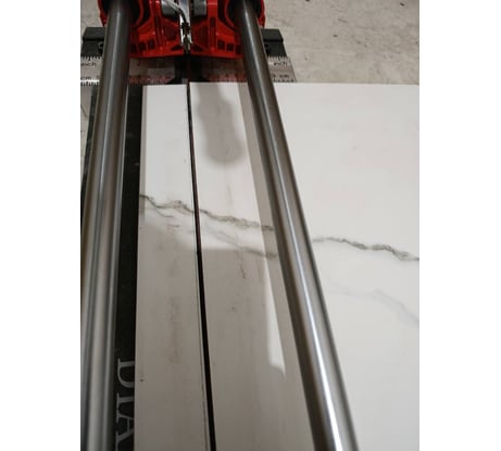 НЕ понятно почему в наличии нет запасных резцов, т.к. надо брать сразу про запас со станком, чтобы потом не бегать Ручка станка и каретка очень массивные и грубые. Резать нежно!!! настенную мелкую глиняную плитку, типа кабанчика или другую выпуклую или впуклую с нежной эмалью будет большая проблема, можно передавить, будут сколы на эмали. Станок больше предназначен для большой крупной плоской плиткой. Есть небольшие сколы краски на красных алюминиевых элементах, но это ерунда при цене 13 ты и простой картонной упаковке. Резец в комплекте Диам режет хорошо, но сколы. резать надо очень нежно, чтобы получить чистый рез. На длинной плитке 60-90 см думаю будет дуга в 1-2 мм как на всех подобных плиткорезах. Плитку порезать на соломку по 1 см запросто (известный трюк), но отломить от целой плитки полсоку 1-2 см, надо уже под лапку использовать подкладку. На лапку лучше наклеить кожу или скотч в неск слоёв, она без накладки пластиковой, чисты алюминий.