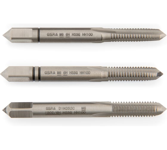 Ручные метчики GSR M6х1 HSSG DIN352 6H набор 3 шт для глухих и сквозных отверстий B00105190 для метрической ISO-резьбы М состоит из трёх метчиков - первый (черновой), средний (получистовой) и третий (чистовой). Метчики до М6 имеют утолщённый хвостовик и 3 канавки.