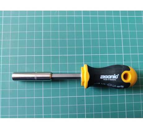 Неплохая ручка битодержатель чуть меньше своих конкурентов от Wera, более тонкая. Обрезиненная. Магнита внутри нет, шарик в конце ручки.