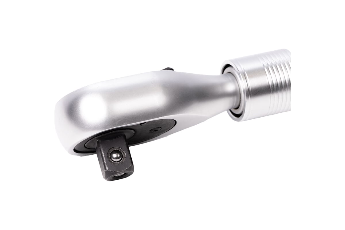 Трещотка изготовлена из высококачественной легированной хромованадиевой инструментальной стали, с последующей закалкой до твердости в пределах 46-48HRC, что обеспечивает оптимальное соотношение прочности и твердости. Эргономичная телескопическая рукоять обеспечивает надежное удержание инструмента и комфортную работу, а благодаря высококачественным компонентам рукоять обладает высокой стойкостью к агрессивным средам. Регулируется по длине от 300 до 410 мм