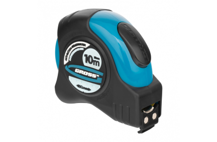 Рулетка Gross «Schlagfest» 31115 с магнитным обрезиненным зацепом, двухсторонней шкалой и функцией автоматической фиксации полотна, 10 м х 25 мм, позволяет определять размеры материалов, вычислять площадь помещения и проводить другие измерительные работы Карманная рулетка — незаменимый инструмент в хозяйстве и на строительной площадке. Магнитный обрезиненный зацеп обеспечивает возможность захвата скользких и металлических поверхностей со сложной формой.