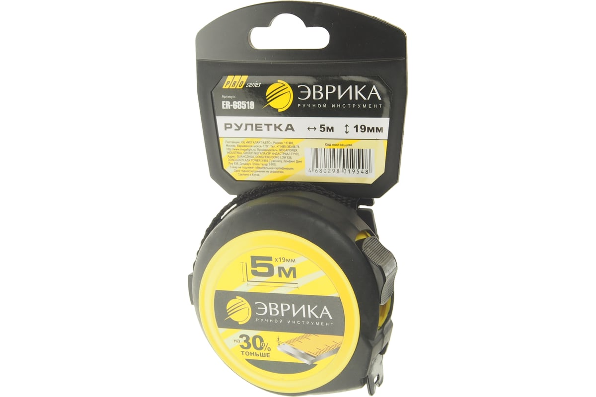 Рулетка ЭВРИКА 5м 19мм YELLOW профессиональная Pro-Grade с держателем ER-68519 обеспечивает процесс измерений деталей различной формы, а также помогает при проведении строительных и отделочных работ.