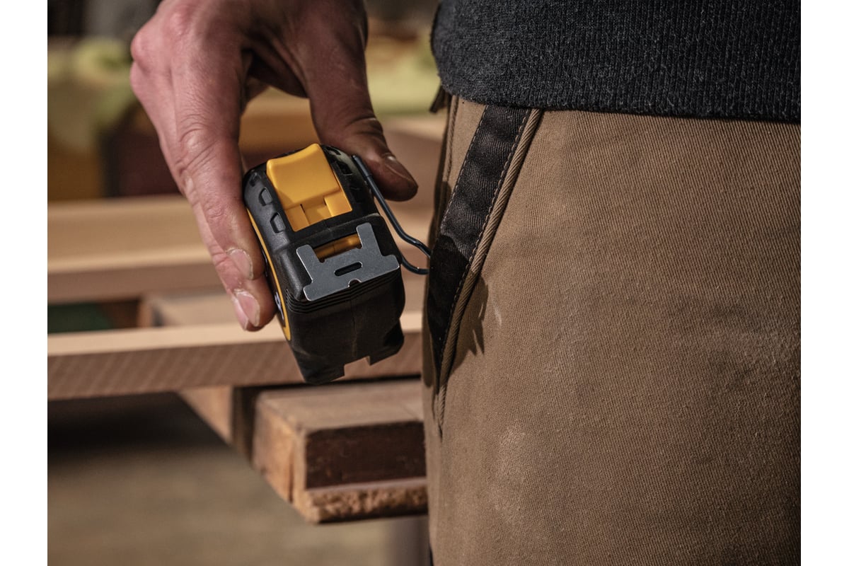 Крючок с абразивным покрытием обеспечивает надежную фиксацию ленты на заготовках, а шкала с обеих сторон ленты позволяет легко считывать показания. Закругленный зажим не повреждает ремень или карман.