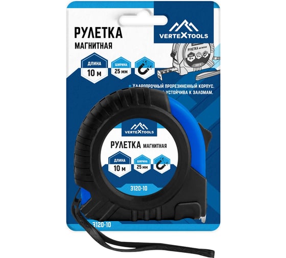 Рулетка vertextools магнитная 10х25 мм 3120-10 применяется для проведения измерений при строительных и монтажных работах. При изготовлении корпуса рулетки применена ударопрочная пластмасса, корпус частично обрезинен. Устройство и обводы корпуса рулетки имеют эргономичную направленность. Механизм фиксации надёжно останавливает мерную ленту. Измерительная лента имеет полимерное покрытие, стойкое к абразивному воздействию. Основание ленты оснащено магнитным зацепом.