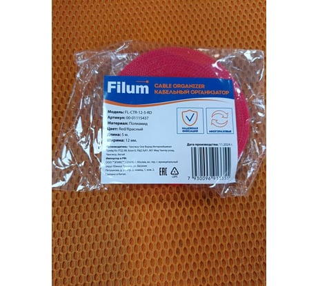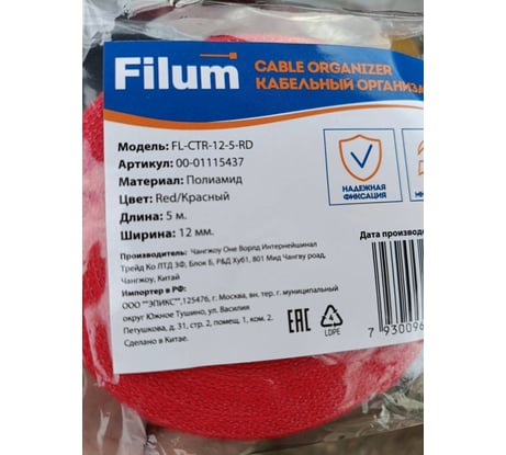 Рулон липучки Filum ширина 12 мм, длина 5 м, цвет красный, кабельный организатор FL-CTR-12-5-RD