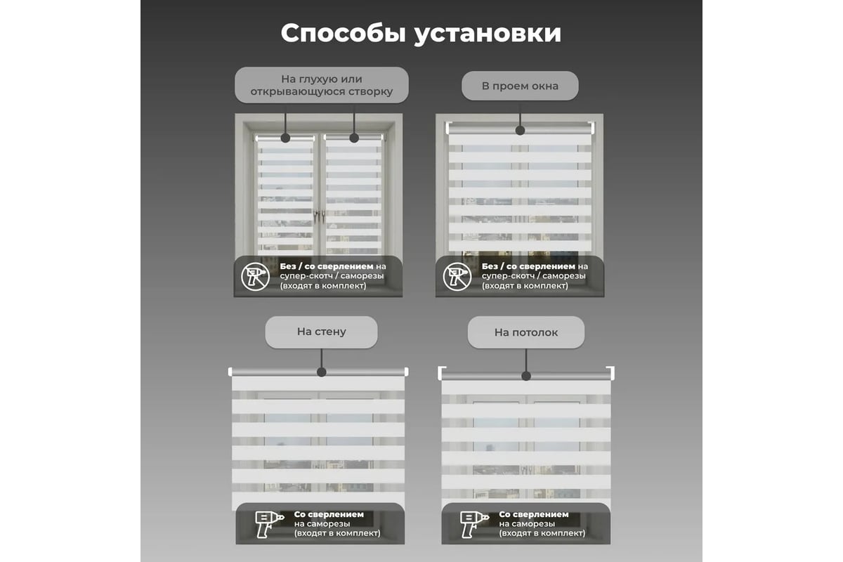 Штора состоит из двух слоев ткани разной прозрачности. Перемещая слои друг относительно друга, можно создать нужный уровень освещения и приватности.