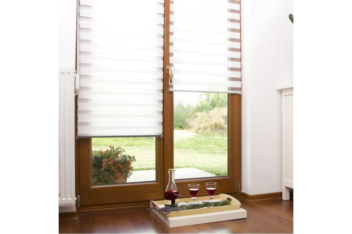 Рулонная штора День-Ночь состоит из двойной ткани, которая создает чередование прозрачного и плотного материала. Смещая эти слои относительно друг друга с помощью цепочки, можно регулировать количество света, попадающего в комнату.