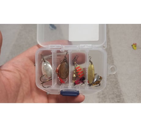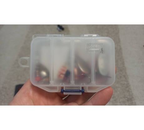 Небольшая удобная коробка для мини набора блесен, удобно положить в карман забродного костюма. Влезает несколько блесен, или тейлспиннеров, максимальный размер вертушки Mepps 3 номер. Качество как всегда у meiho на высоте.
