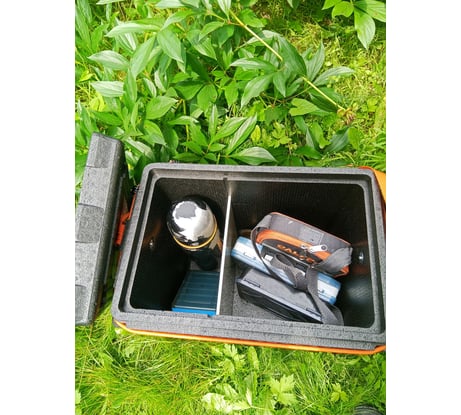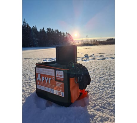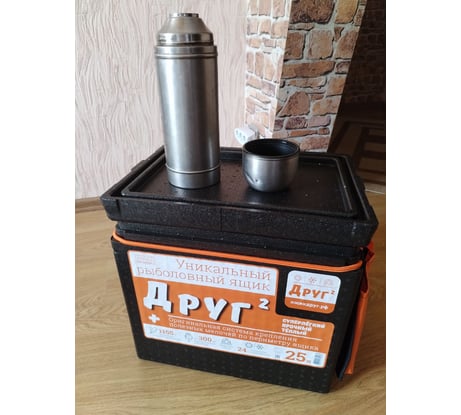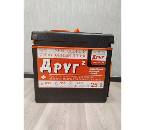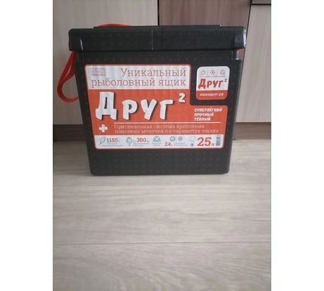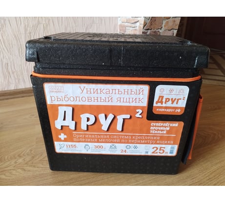 Ящик на 25л хорошо подойдёт для людей среднего роста 165-180см. Для остальных есть вариант 20 либо 30л. Изготовлен ящик из легкого и прочного пенополипропилена, он прочный и при небольшом собственном весе выдерживает нагрузку до 300 кг, так что на нём можно спокойно сидеть и даже стоять. Он отталкивает влагу, поэтому он может стоять в воде и его не придется просушивать. Материал не впитывает запахи. Поскольку он изотермический контейнер, то обеспечивает отличную теплоизоляцию. Внутри ящик разделён перегородкой на два отсека. В нем можно переносит снасти, приманки, личные вещи, еду и даже свой улов. Крышка у него переворачивается, можно использовать как столик. Уникальность ящика в том, что он поплавок и не тонет в воде, что важно при использовании по перволедью и в период тонкого льда. Но лучше эту функцию на себе не пробовать. У ящика ДРУГ 2+ есть удобная система крепления по периметру, в виде прочной резинки, которая надежно удержит рыболовные аксессуары, например, варежки или полотенце. А в подвесной карман можно положить черпак, багорик и удочку при переходе на другое место. Переносить его можно на лямке через плечо.