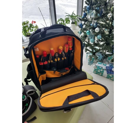 Довольно вместительный рюкзак, все необходимое и даже более рационально помещается без труда. Сшит качественно, крепко. Пластиковое, непроницаемое днище. Качественная фурнитура, крупная застежка - в перчатках пользоваться удобно. Удачное решение с двойной внутренней ручкой - если рюкзак расстегнут, его без проблем можно перенести по объекту не застегивая и не теряя из него предметы. В отделение под ноутбук помещается 16 дюймовый ноут старого формата с толстой окантовкой экрана. С недавних пор проверил и оказывается 17 дюймовый ноут с тонкой рамкой также влезает. Ранее пользовался рюкзаком STANLEY, там прикольная фишка - отделяемые ложементы под ручной инструмент - очень продуманно на мой взгляд, когда необходимо пользоваться только ими. Что не совсем понравилось, но это в большей степени придирки - это тонковатая верхняя ручка, когда рюкзак под завязку нагружен было бы комфортнее его нести если бы ручка была потолще и прорезиненной, как у старого STANLEY. Также на плечах его долго не поносишь, спинка там далеко не как у туристических рюкзаков, но это все таки специфика строительных аксессуаров. Пользуюсь им уже 3,5 года, тогда он обошелся 5 тыс.рублей, сейчас за 12 тыс.рублей я бы крепко подумал прежде чем покупать его.